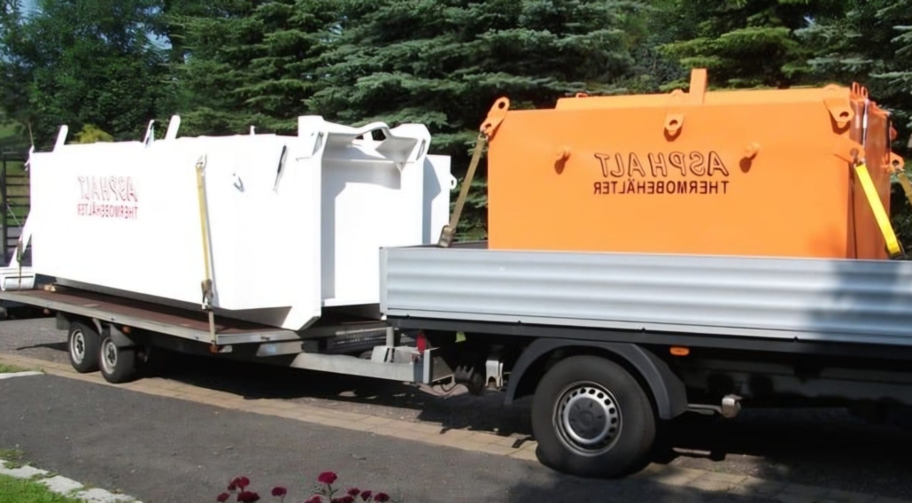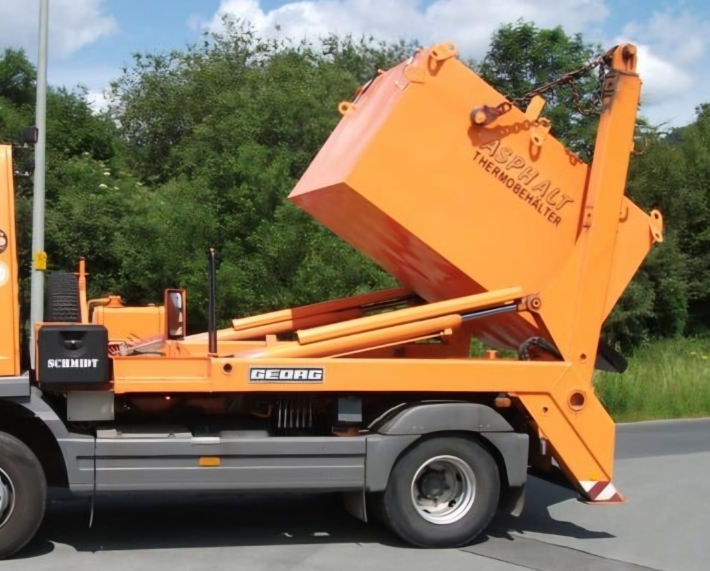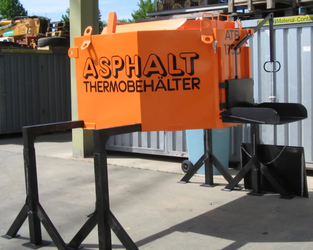Unsere Asphalt-Thermobehälter sind zum Warmhalten und Dosieren von Mischgut konzipiert. Die Behälter können wahlweise auf Kipper-, Absetz- und Hakenfahrzeuge, auf Kabel- und Kippanhänger aufgeschraubt werden.